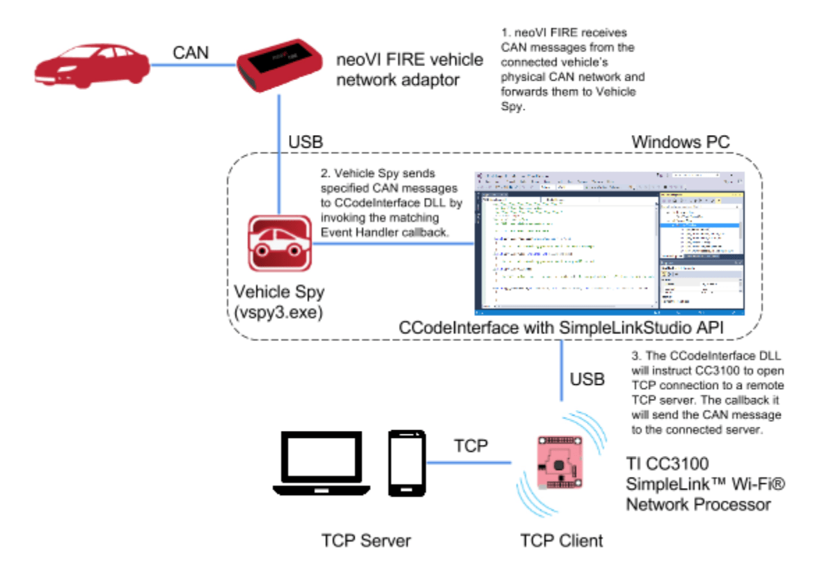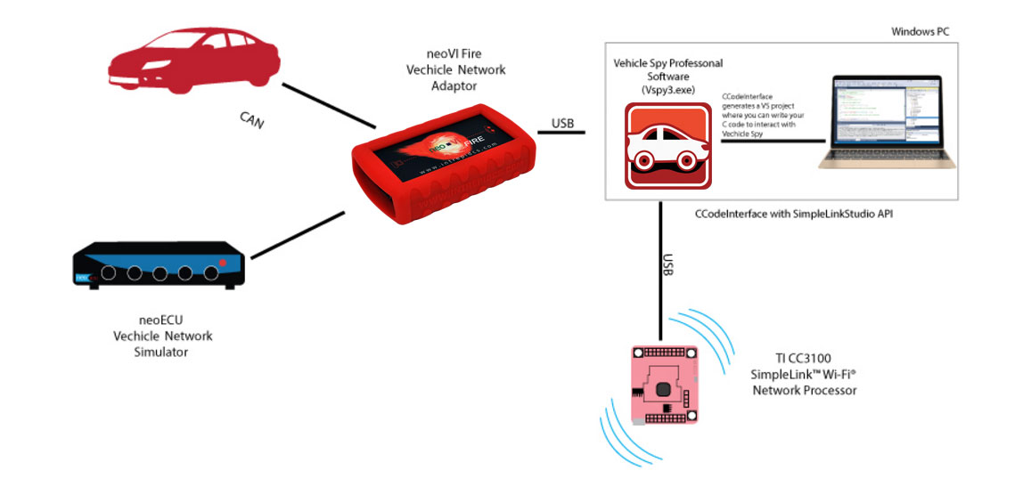 The C Code Interface feature in Vehicle Spy Pro provides a way to write C code in Visual Studio to create your custom application that interacts with Vehicle Spy. Using the bundle, you will be able to extend your C Code Interface project to interface with the CC3100 wireless network processor. This allows you to write an application that leverages all the features of both Vehicle Spy and CC3100. The result is an automotive IoT application that connects your vehicle to the internet.