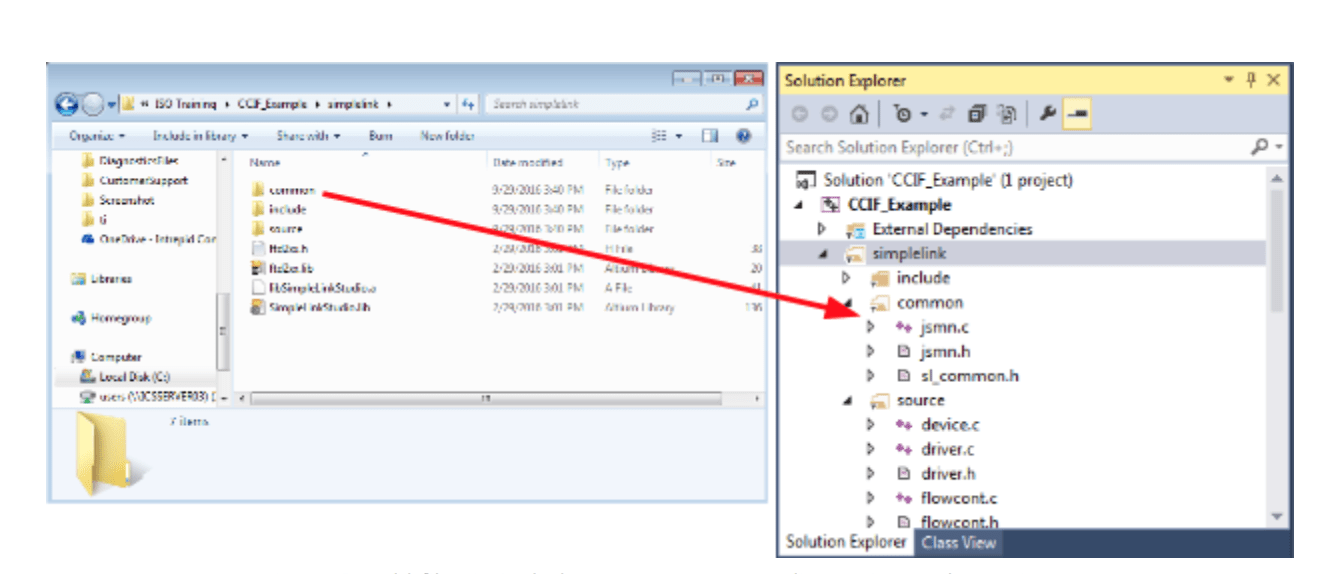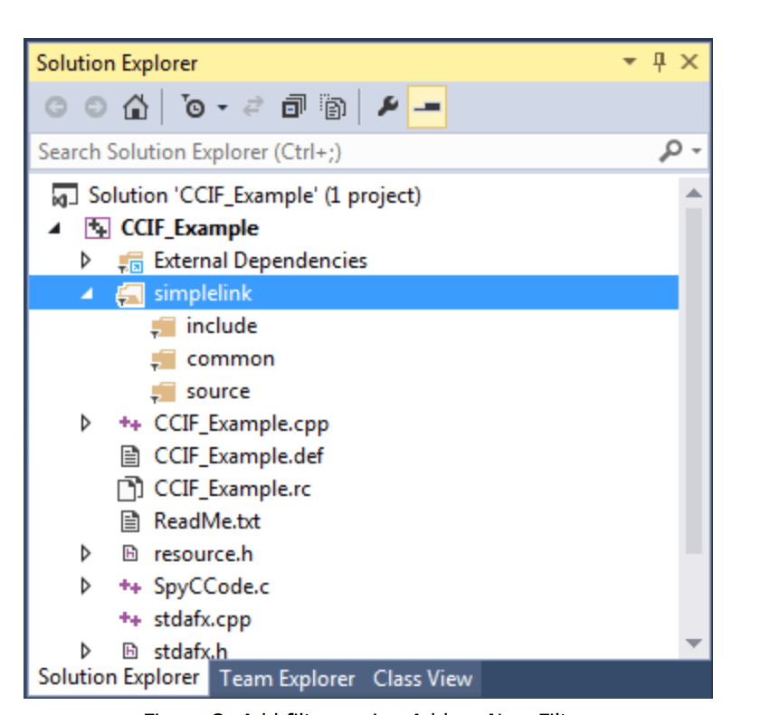 In Visual Studio, right click on the project and use Add -> New Filter to add a ‘simplelink’ directory with three sub directories named ‘include’, ‘common’, and ‘source’. Then, drag and drop all contents of each directory from your project directory.