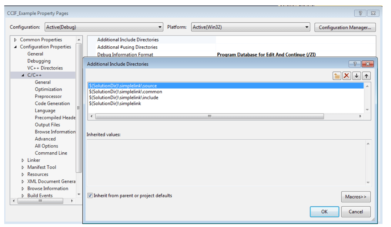 Figure 4: Add simplink include paths to the project. - Goto Configuration Properties -> Linker -> Input -> Additional Dependencies. Add