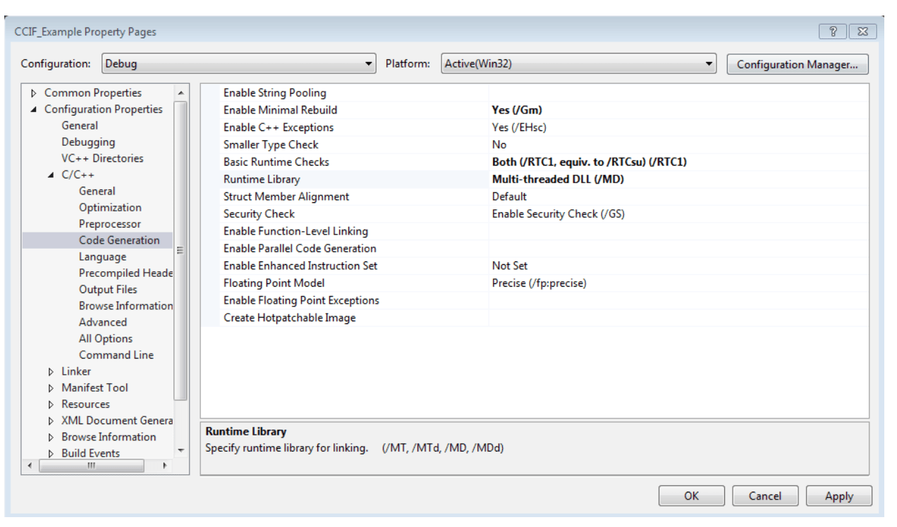 - Goto Configuration Properties -> C/C++ -> Code Generation -> Runtime Library. Set to ‘Multi-threaded DLL (/MD)’.