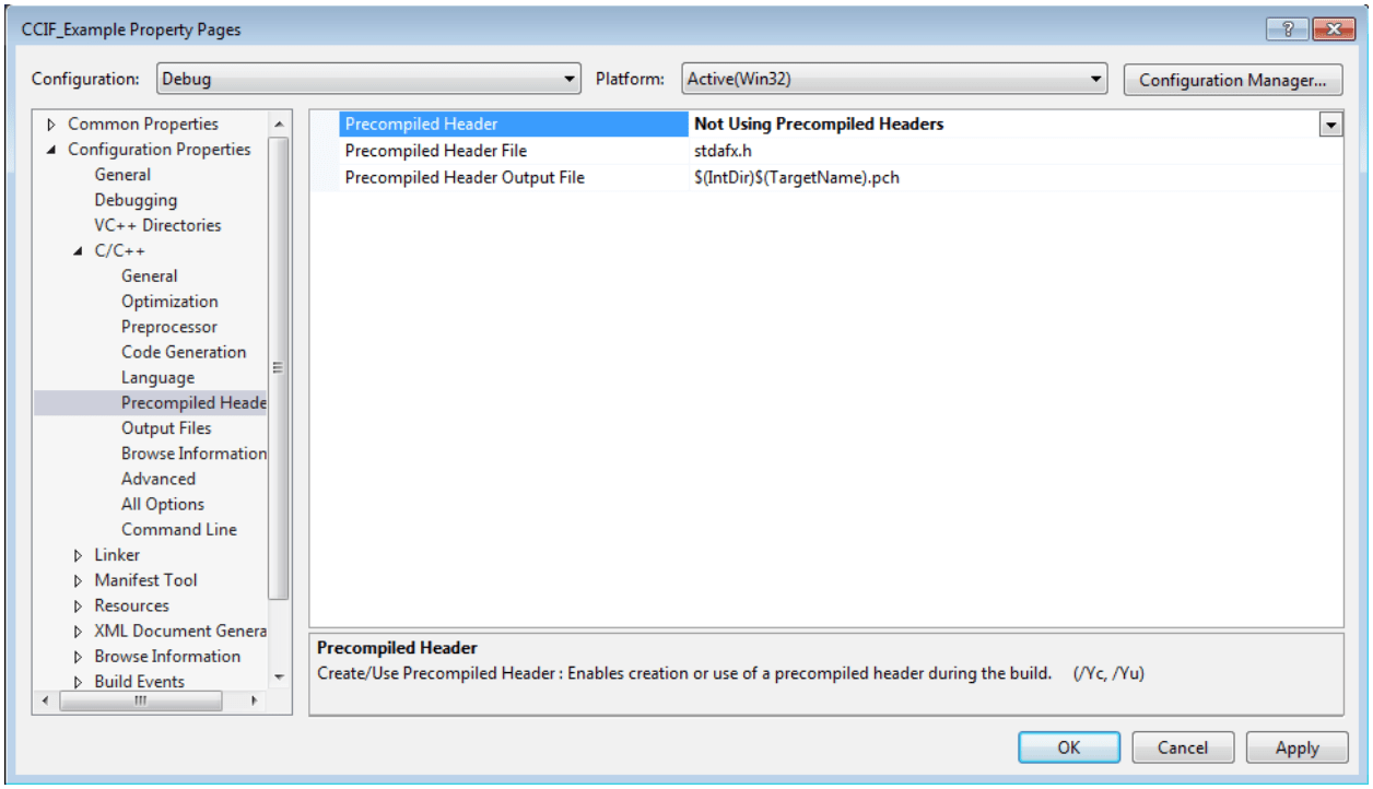 Figure 7: Change Precompiled Header to ‘Not Using Precompiled Headers’. - Include “simplelink.h” in SpyCCode.c. Then, copy and paste the following function stubs in SpyCCode.c. These are asynchronous callback functions used by SimpleLinkStudio™ to notify various network events and need to be defined somewhere in your program.