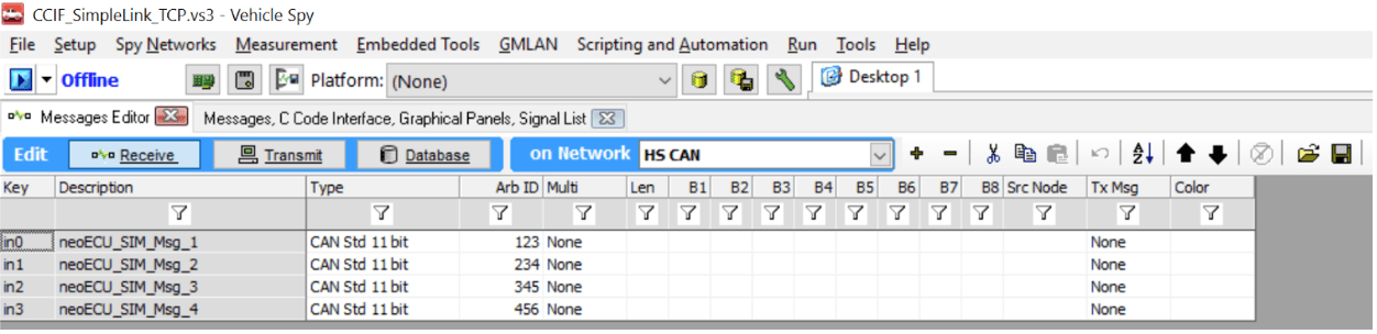 - Anytime Vehicle Spy receives a CAN message that matches one of the four messages defined in the Receive Table of the Messages Editor, CCIF_SimpleLink_TCP.vs3 will invoke the matching Event Handler callback function defined in the C Code Interface DLL. When Vehicle Spy invokes the callback function, it will pass the pointer to the CAN Message object to the DLL.