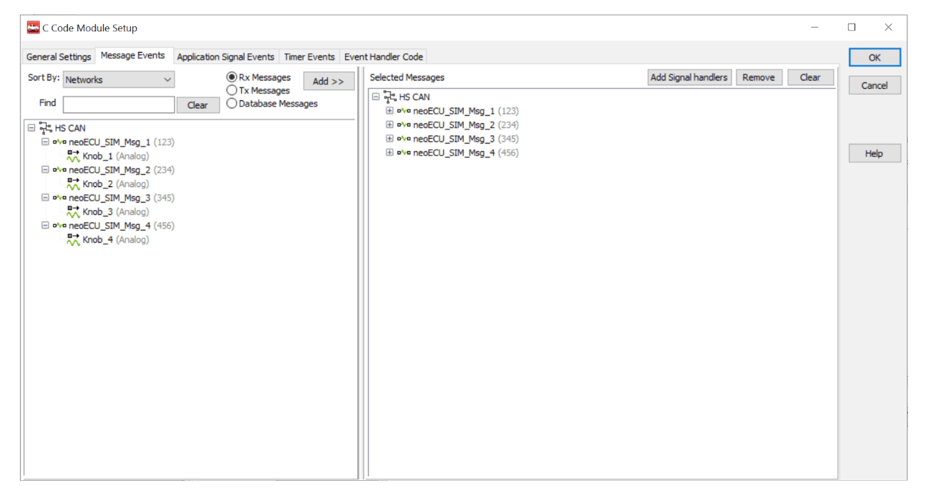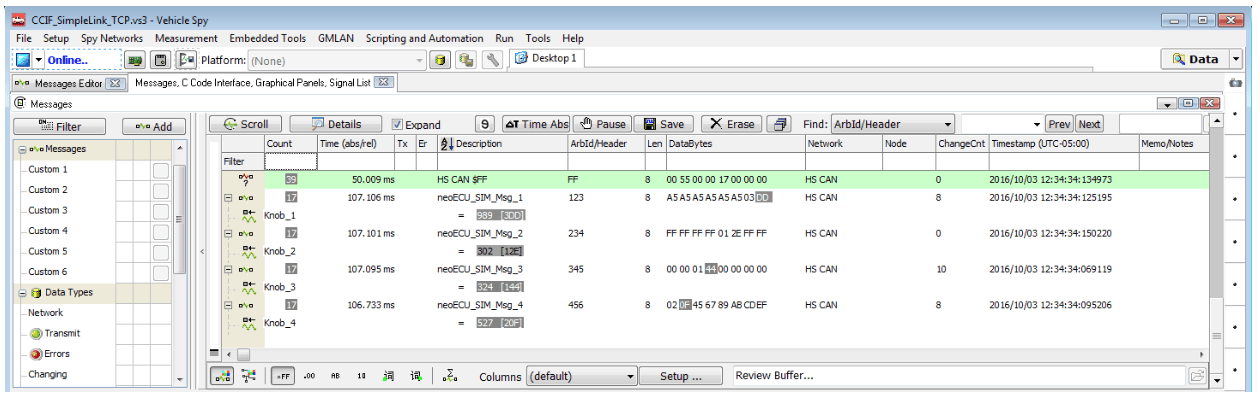 Figure 6: Messages window showing the four CAN Messages mapped to neoECU Simulator Knobs. - Verify that Vehicle Spy has successfully loaded the C Code Interface DLL by observing the ‘Output’ tab of the C Code Interface window.