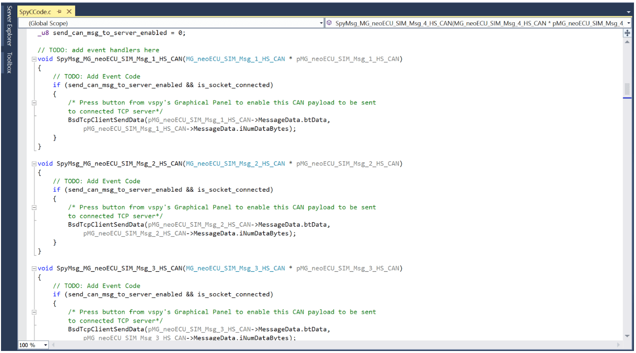 Figure 2: C Code Interface ‘Edit’ window showing Event Handlers for the four Receive Messages - The Event Handler callback receives the CAN Message from Vehicle Spy and sends the 8 byte content of the message to the connected server via socket.