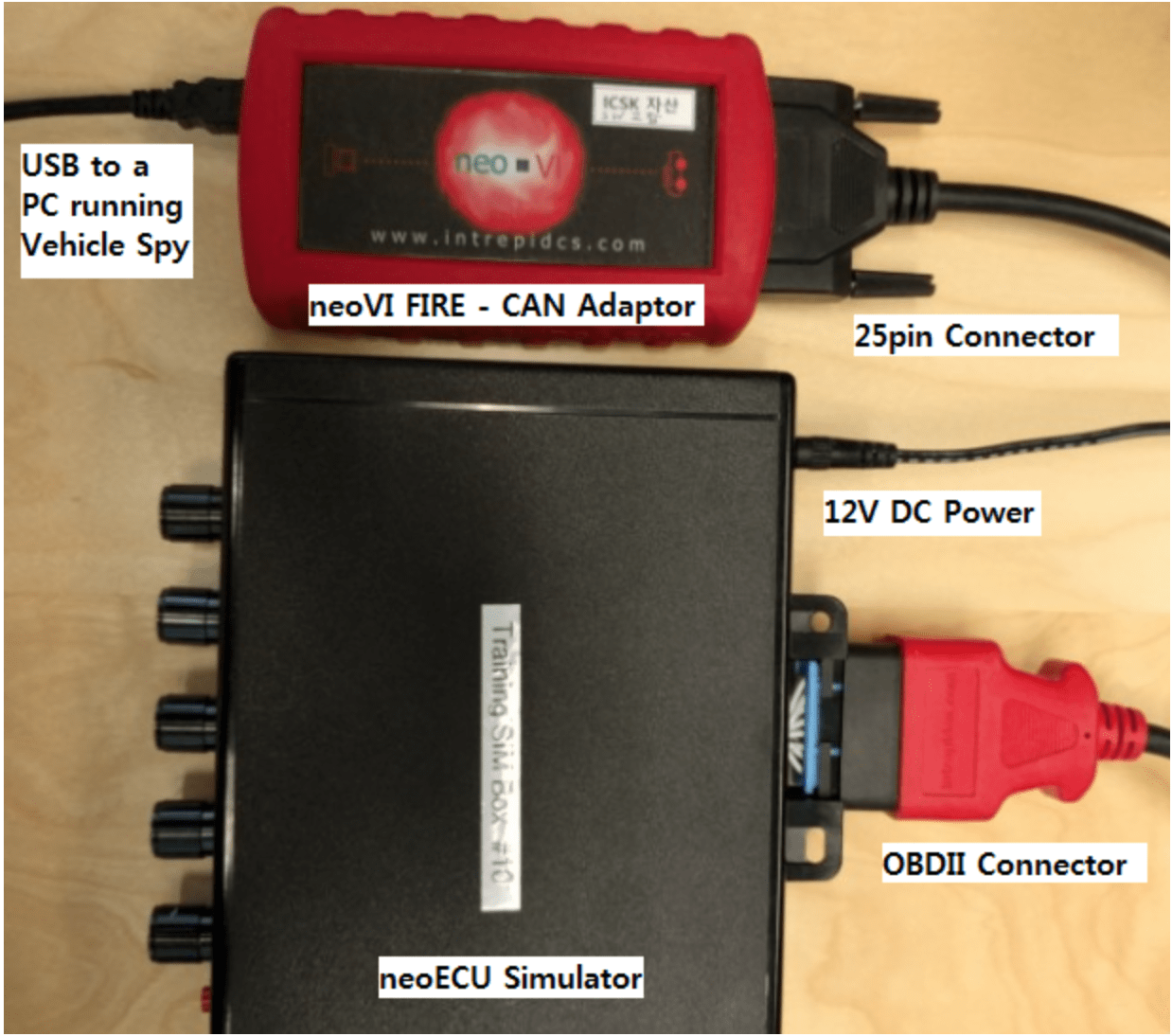 - neoVI FIRE – CAN network interface. Connects to vehicle network bus via 25pin connector. Connects to Vehicle Spy PC software via USB.