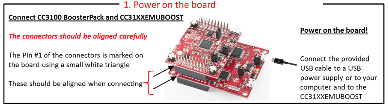 Figure 4: Connecting CC3100 from http://processors.wiki.ti.com/index.php/CC31xx_Quick_Start_Guide. - Make sure CC3100 board is properly connected to your PC. Open Vehicle Spy. When you start Vehicle Spy, it should have full read & write access to the connected CAN bus via the neoVI FIRE adaptor. Start Vehicle Spy by pressing the play button on the top left corner of the window. You should see a real-time trace of all CAN messages generated by your vehicle or the neoECU Simulator from Vehicle Spy’s Messages view.