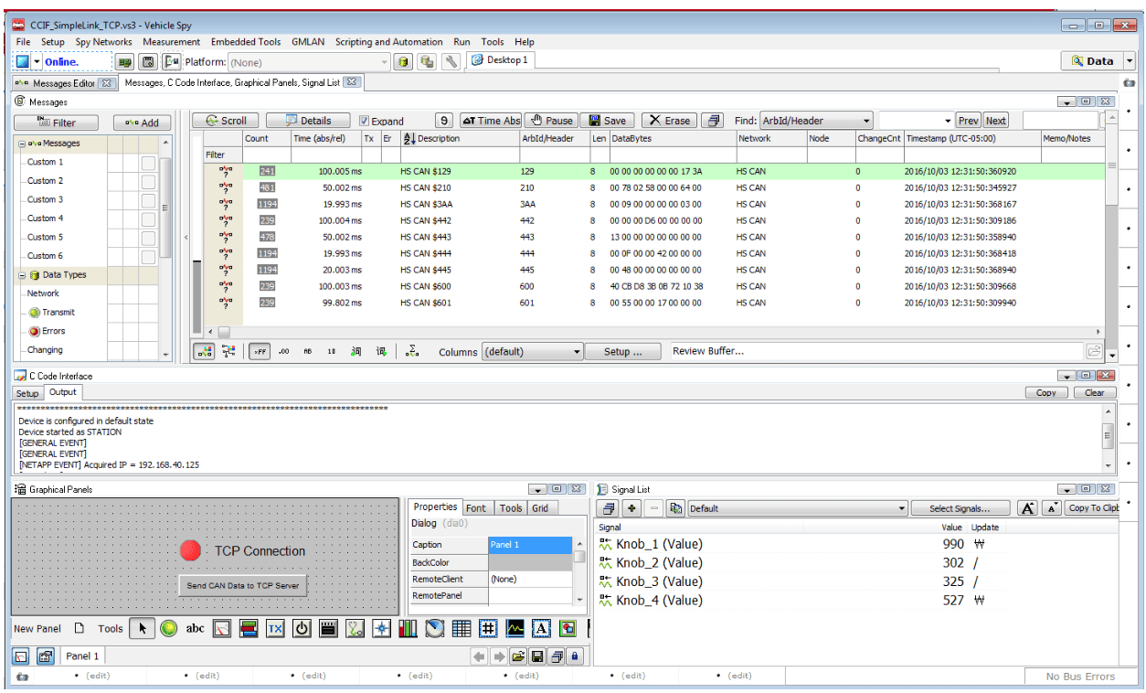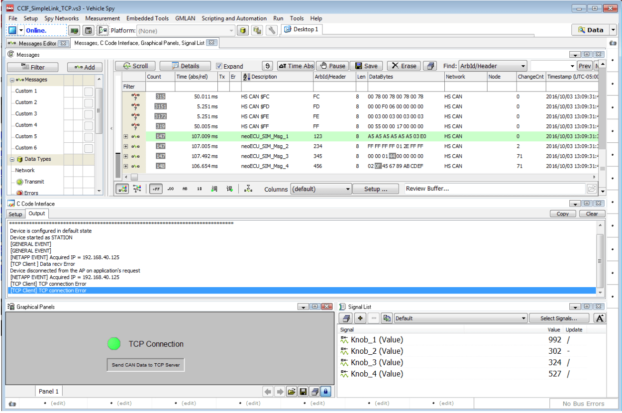Figure 5: Messages window showing real-time CAN traffic and CCodeInterface window showing output from DLL. - Identify the four CAN messages that contain data that represents the first four knobs on the neoECU Simulator. Vehicle Spy will send those messages to the C Code Interface DLL, which will then forward them to a remote TCP server via connected socket.