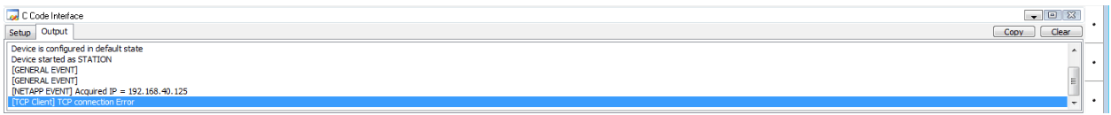 Figure 7: CCodeInterface Output console showing CC3100 connection status. - Setup a remote TCP Server on your Smartphone, MAC, or PC with proper IP address and port number. If you are using an Android phone, convenient way to do this is to download the TCP/UDP TEST TOOL app by animod from Google Play and use the app to setup a TCP Server.